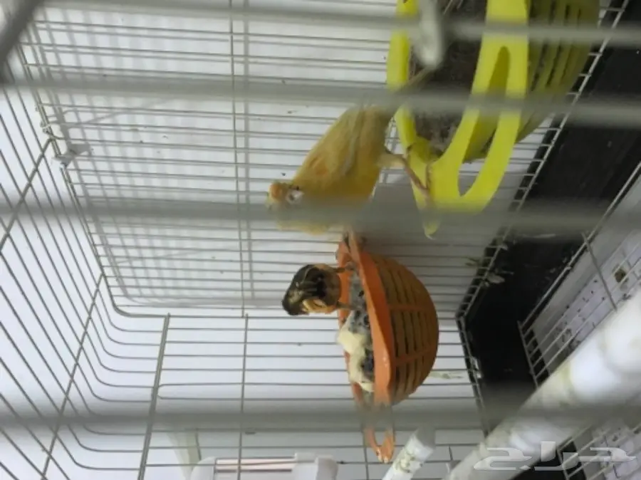 زوج كناري منتج مع 5 فروخ عمرهم بحدود 16 يوم الذكر جزري كرست تقريبا صافي تغريد الأنثى عّم تجهز للبطن الثاني واضح لونها بالصور البيع بقفص 3 ماكليات شمال الرياض مخرج 5